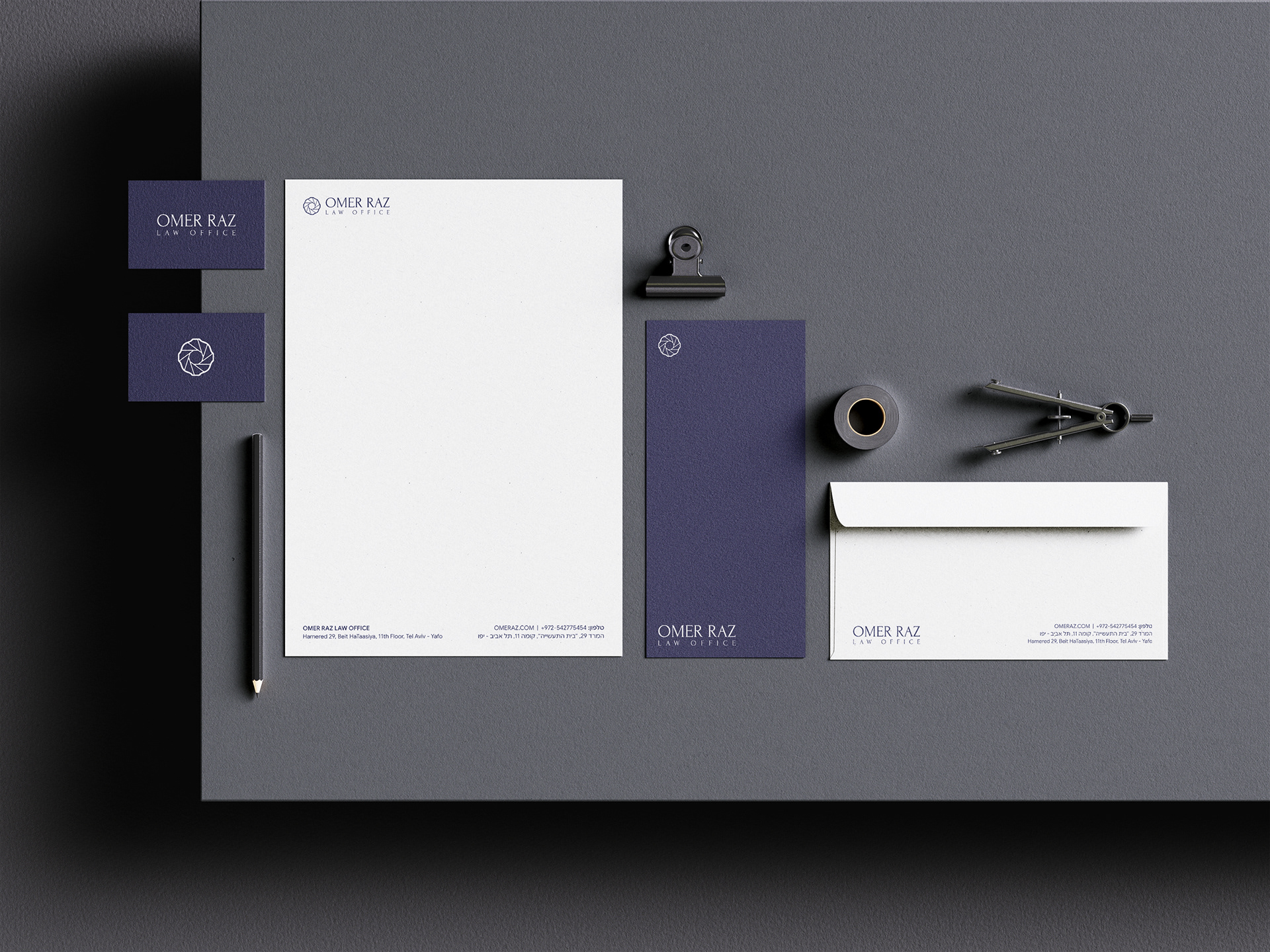 A premium branding project for a boutique law firm. The visual identity balances traditional legal authority with a modern, clean aesthetic. The centerpiece is a geometric circular monogram, symbolizing precision, layered protection, and a 360-degree strategic approach. Paired with a deep navy palette and refined serif typography, the brand positions Omer Raz as a professional, trustworthy, and highly detailed legal partner.